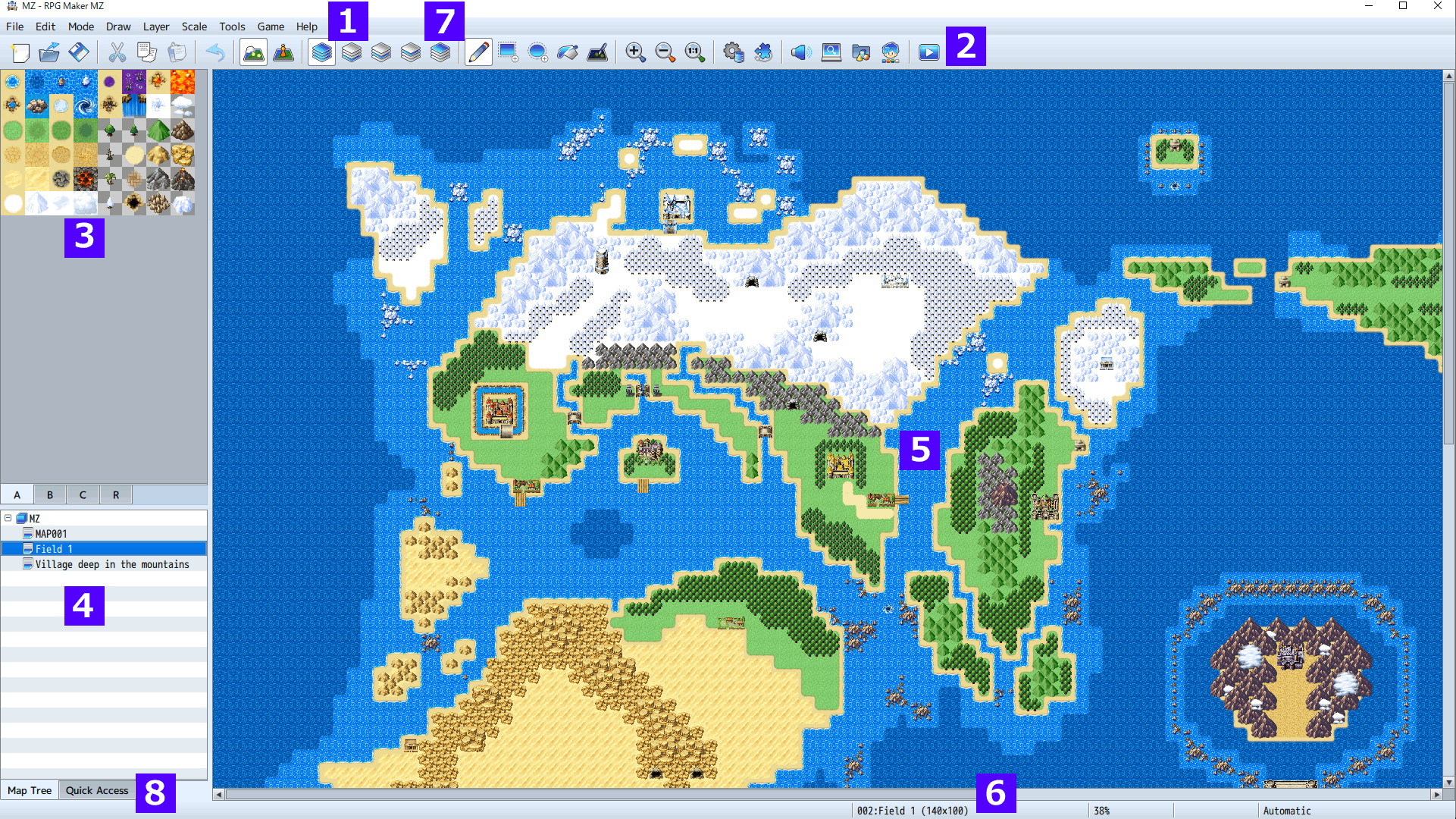 The screen which appears after opening a project is called the "Main Window". The Main Window is used primarily for editing maps and events.